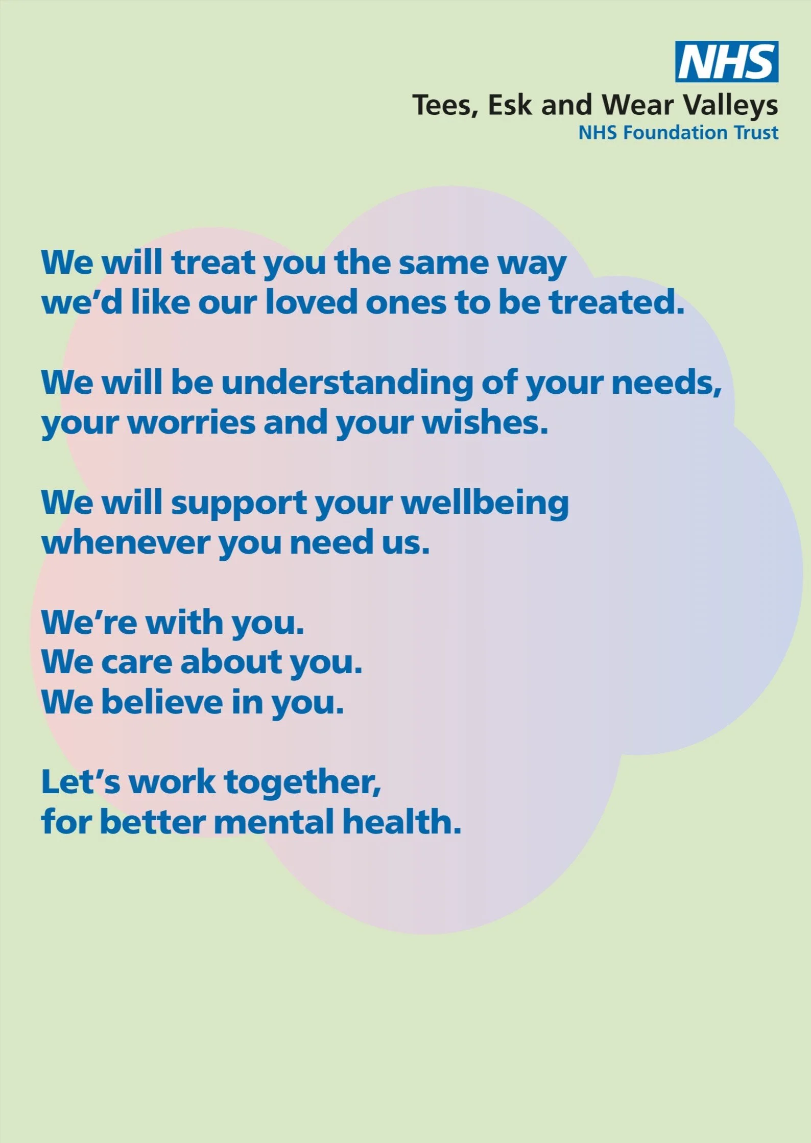 This was an opportunity to shape a communication system underpinned by an emerging recovery framework that’s focused on connectedness, hope, identity, meaning in life, and empowerment. A Tone of Voice developed with, and inspired by people with lived experience of mental health care, their families, carers, and medical professionals. For the people and regions who look to TEWV for help, when their mental health journey faces its toughest moments.